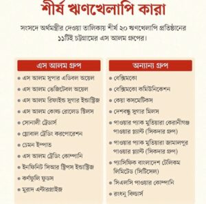 জাতীয় সংসদে অর্থ ও পরিকল্পনা মন্ত্রী আমির খসরু মাহমুদ চৌধুরী দেশের শীর্ষ ২০টি ঋণখেলাপি প্রতিষ্ঠানের তালিকা প্রকাশ করে এই ভয়াবহ চিত্র তুলে ধরেন। তালিকার শীর্ষে রয়েছে এস আলম গ্রুপের একাধিক প্রতিষ্ঠান—এস আলম সুপার এডিবল অয়েল, ভেজিটেবল অয়েল, রিফাইনড সুগার এবং কোল্ড রোল্ড স্টিলস।